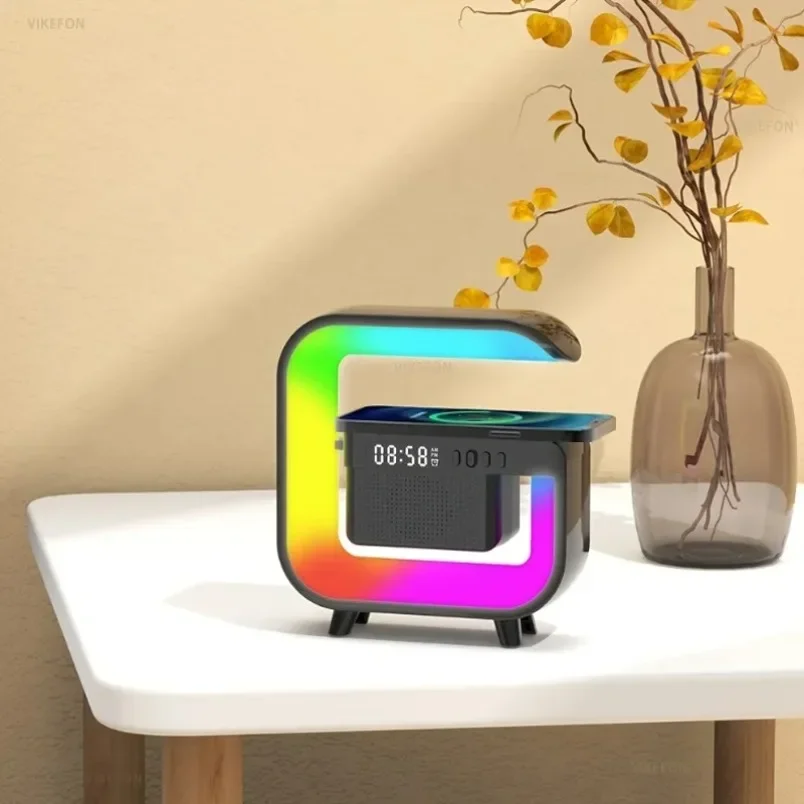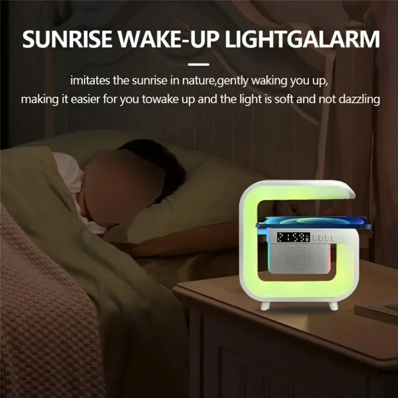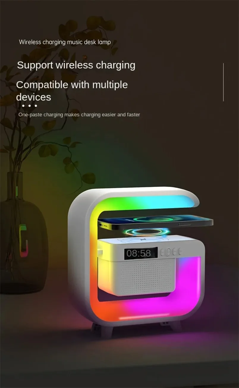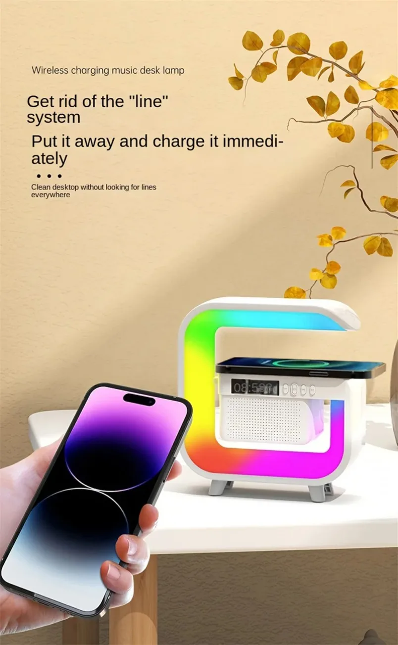 Function description: 15W Fast wireless charging, atmosphere lamp, bedside lamp, dazzling light effect, Bluetooth audio, speaker play and Aux , TF ,Time, Alarm Clock mode.