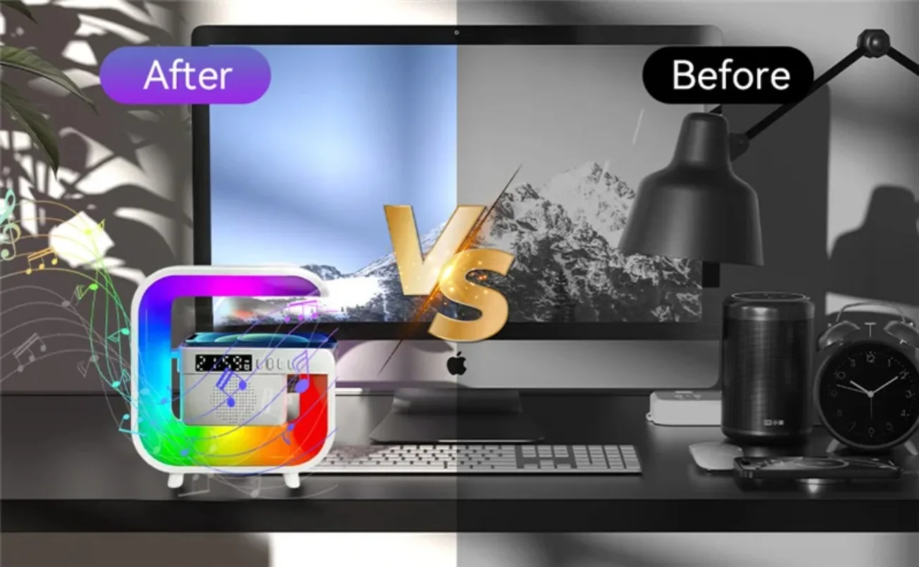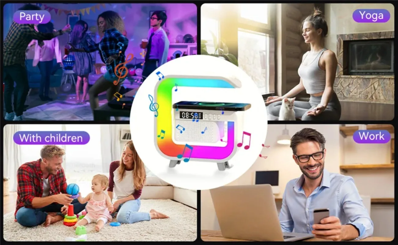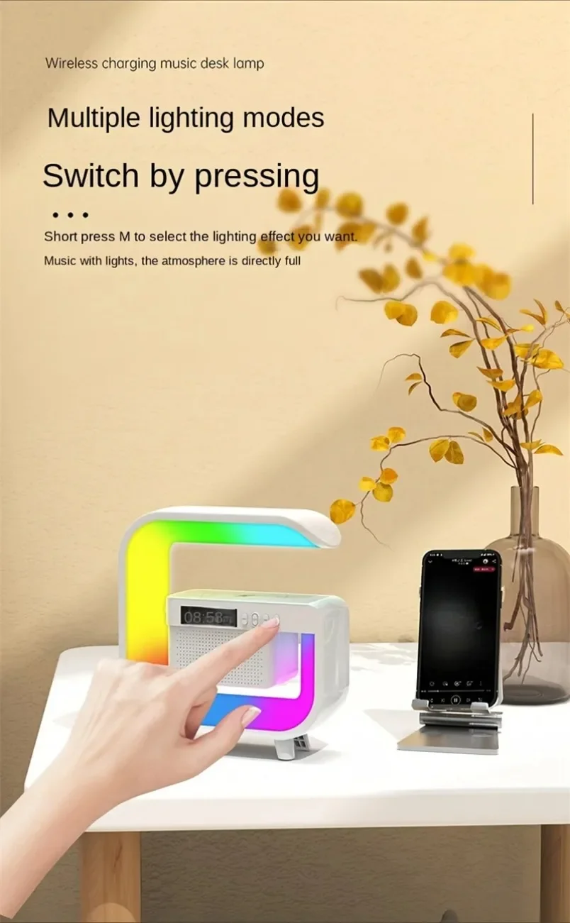 Function description: 15W Fast wireless charging, atmosphere lamp, bedside lamp, dazzling light effect, Bluetooth audio, speaker play and Aux , TF ,Time, Alarm Clock mode.